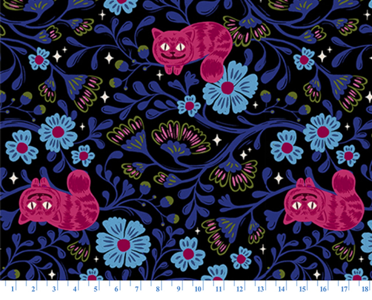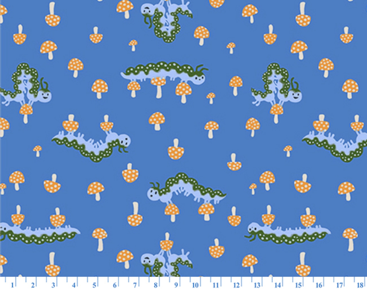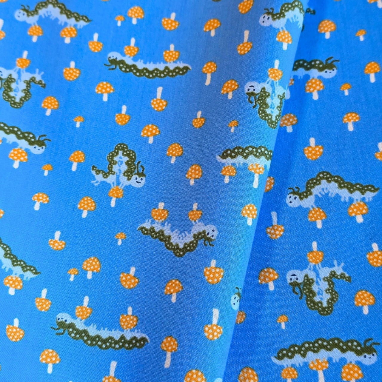 ティーカップに隠れた物語、にやりと笑うピンクの猫きのこの森で遊ぶ青虫たち
